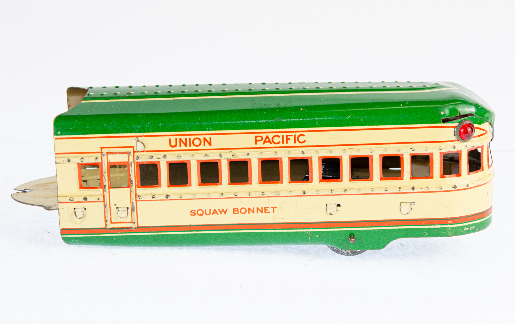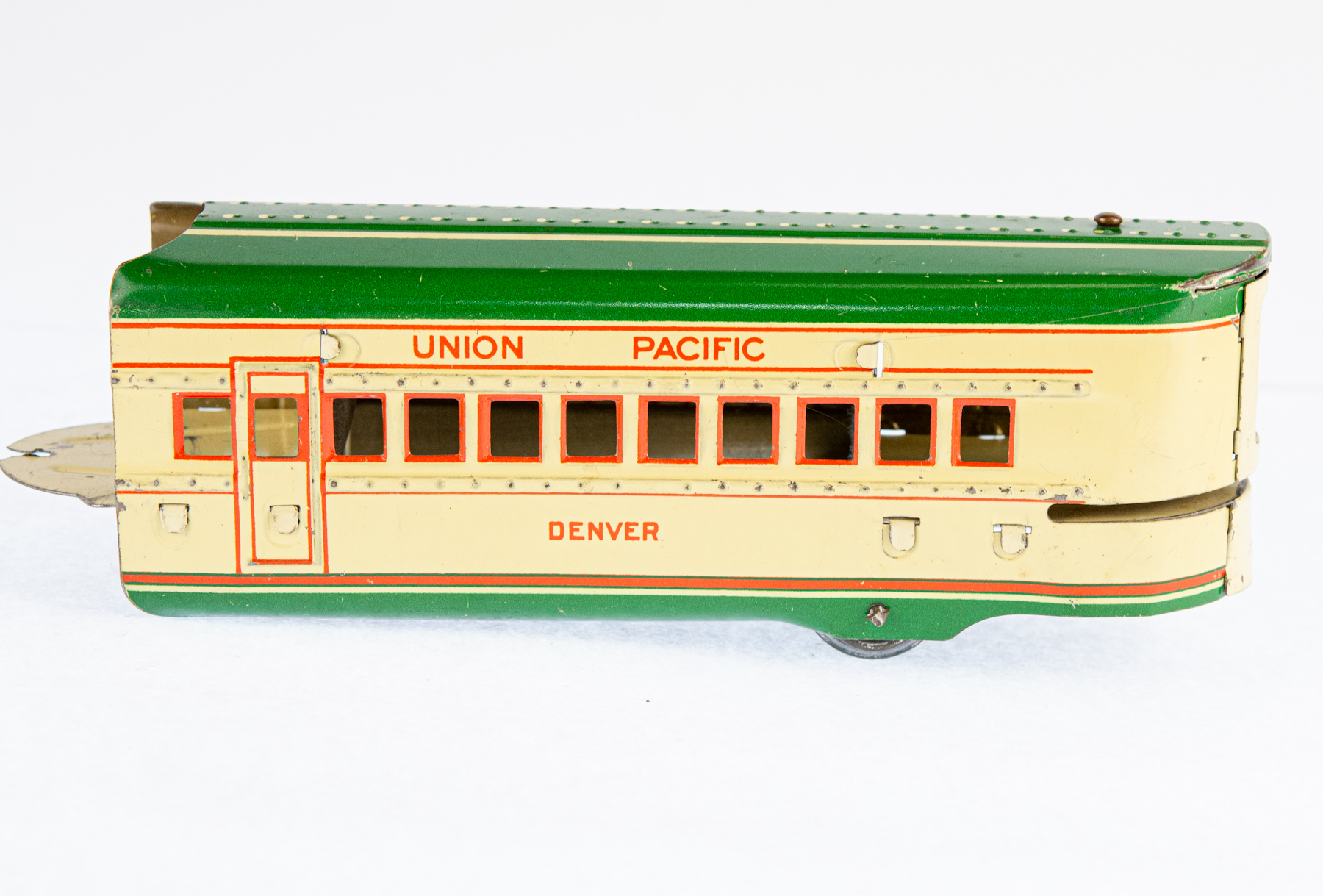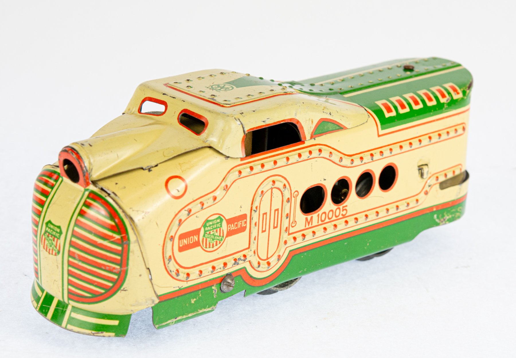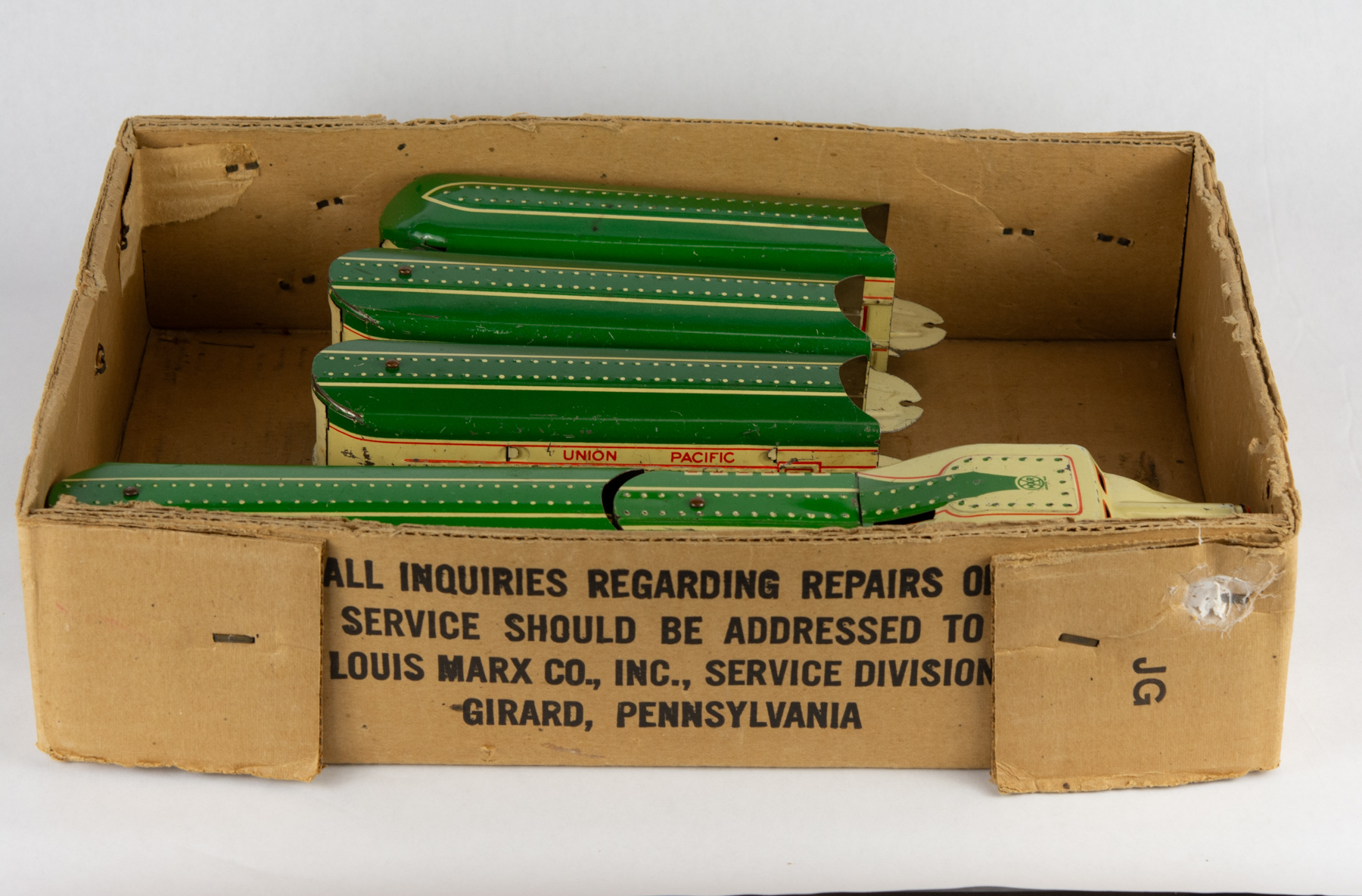 The Marx Streamline Union Pacific No. 8994 is a classic electric toy train set from Louis Marx & Co., celebrated for its sleek, streamlined design and vivid tin lithograph details that mirror the futuristic look of Union Pacific trains from the mid-20th century. Crafted from durable tinplate, the set usually includes a locomotive and matching cars, all packaged in distinctive Marx-branded boxes. This particular model is green and cream.