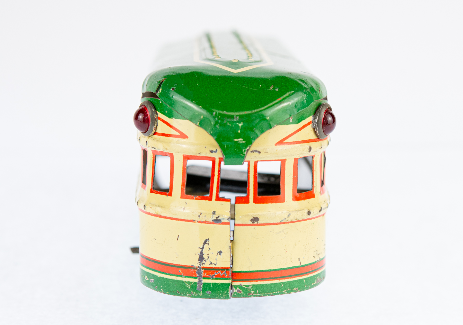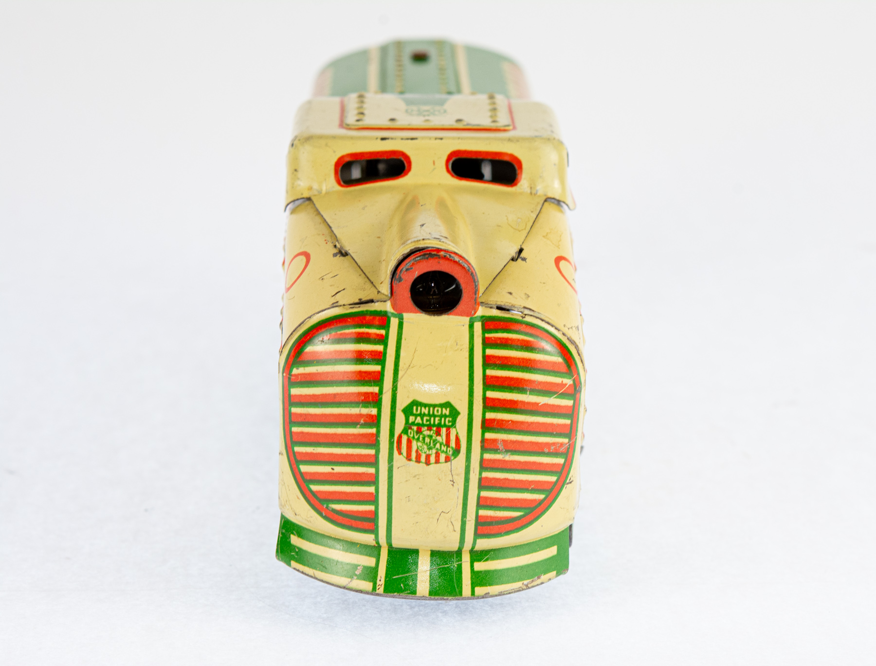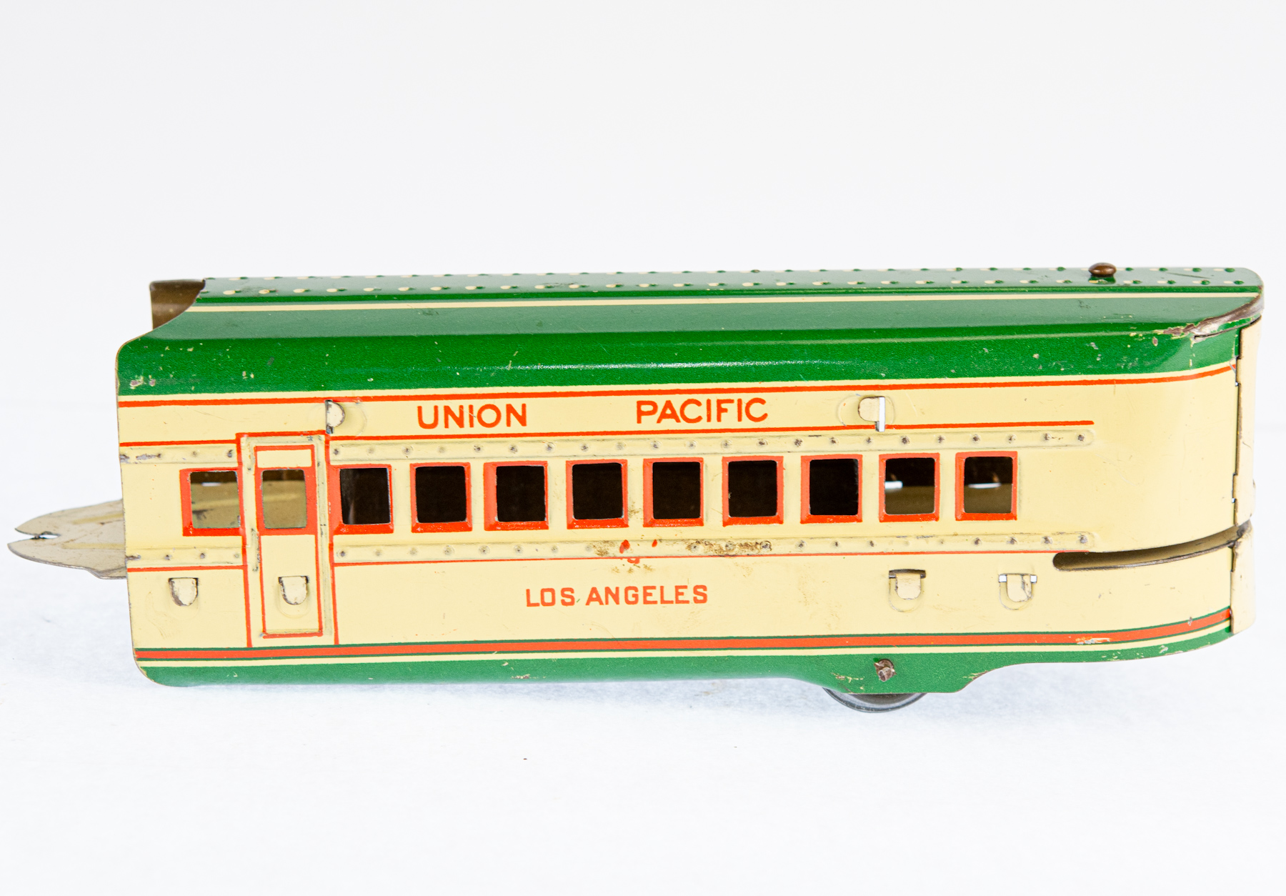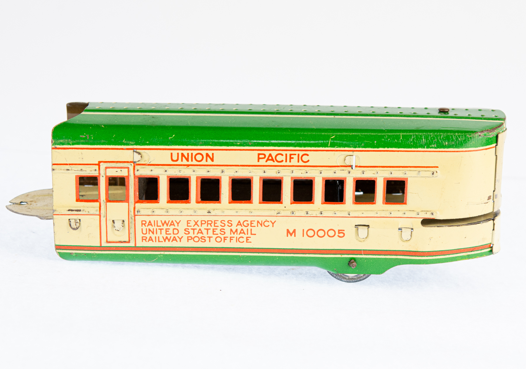 The Marx Streamline Union Pacific No. 8994 is a classic electric toy train set from Louis Marx & Co., celebrated for its sleek, streamlined design and vivid tin lithograph details that mirror the futuristic look of Union Pacific trains from the mid-20th century. Crafted from durable tinplate, the set usually includes a locomotive and matching cars, all packaged in distinctive Marx-branded boxes. This particular model is green and cream.